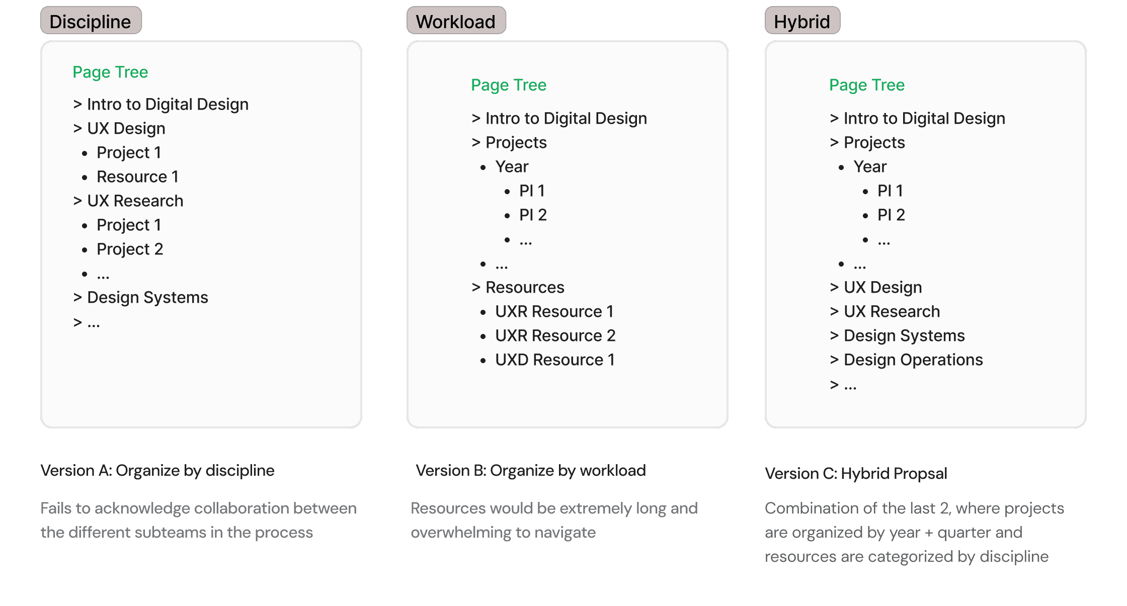 I tested three structural proposals with employees across different roles to find which felt most intuitive to navigate. I chose the hybrid proposal because it balanced two needs that the other versions handled separately — organizing by discipline and by workload — without forcing users to choose one mental model over the other.