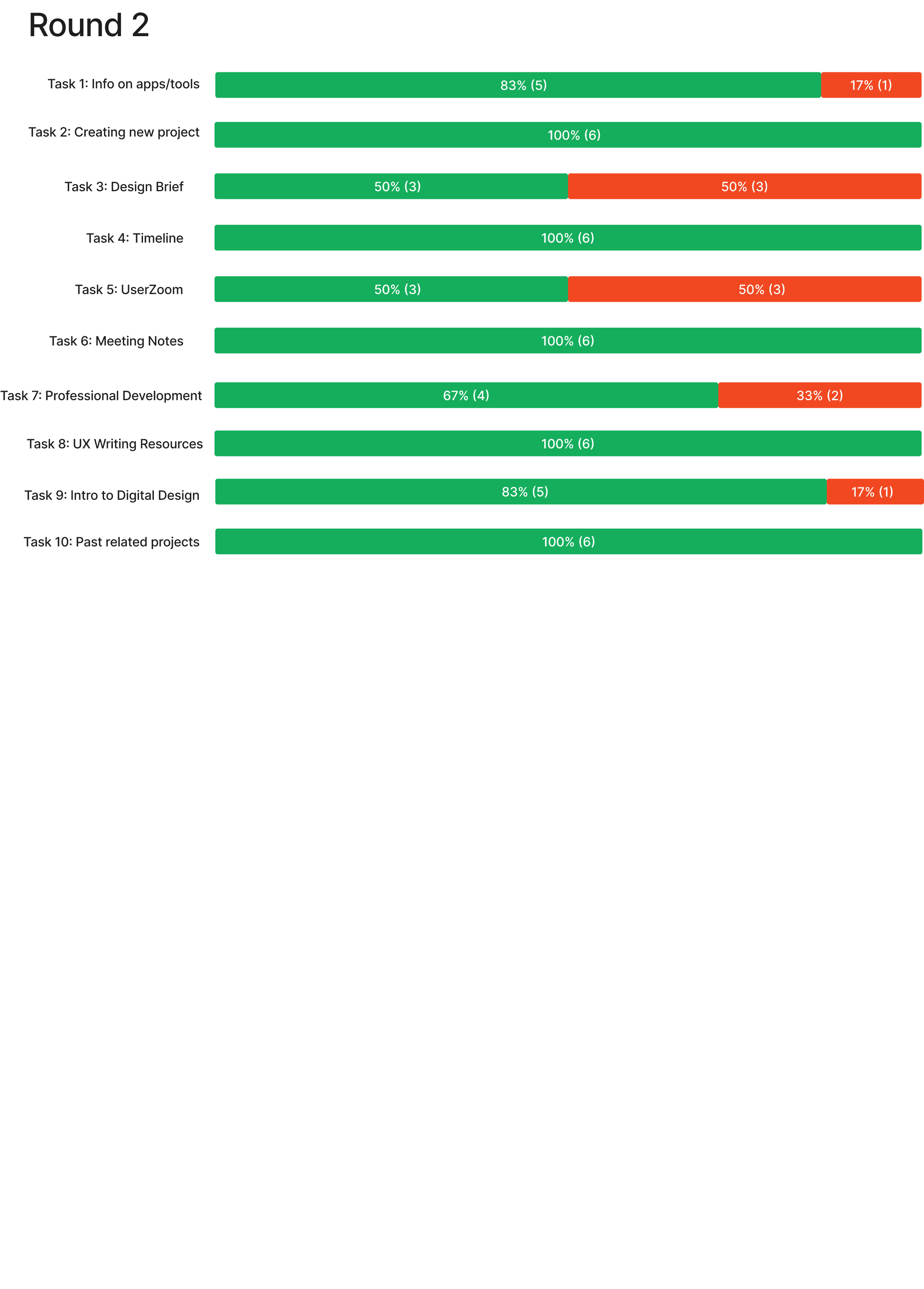 83% of Round 2 participants successfully navigated at least 8 out of 10 tasks — a meaningful improvement. The one persistent challenge that data alone couldn't resolve was the projects section, which led directly to Part 3.